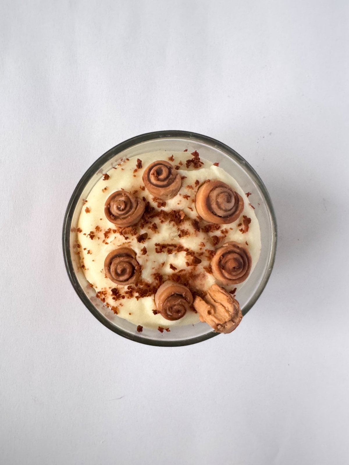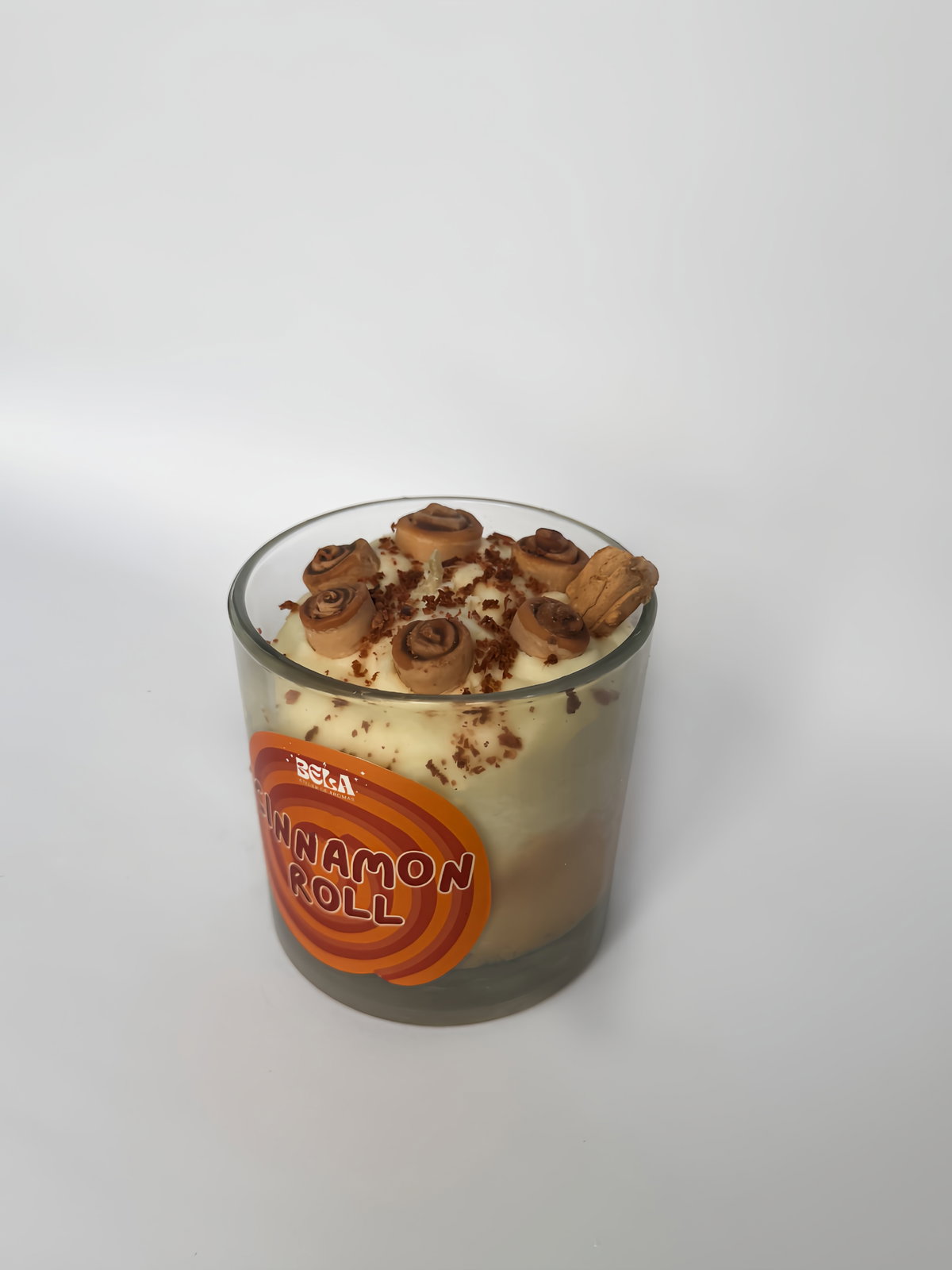 Nuestra velita Cinnamon Roll es un homenaje perfecto a esos momentos que huelen a hogar: masa tibia, canela dulce y glasé derritiéndose lentamente. Inspirada en el clásico roll de canela recién salido del horno.